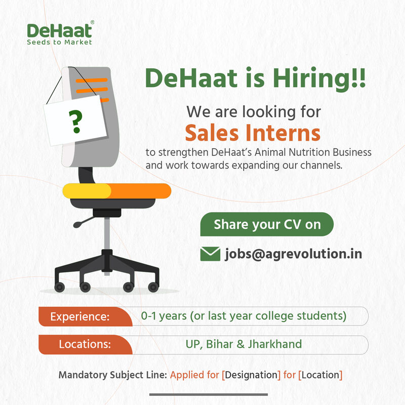 DeHaat is currently hiring for sales interns to strengthen its animal nutrition business and work towards expanding its channels.